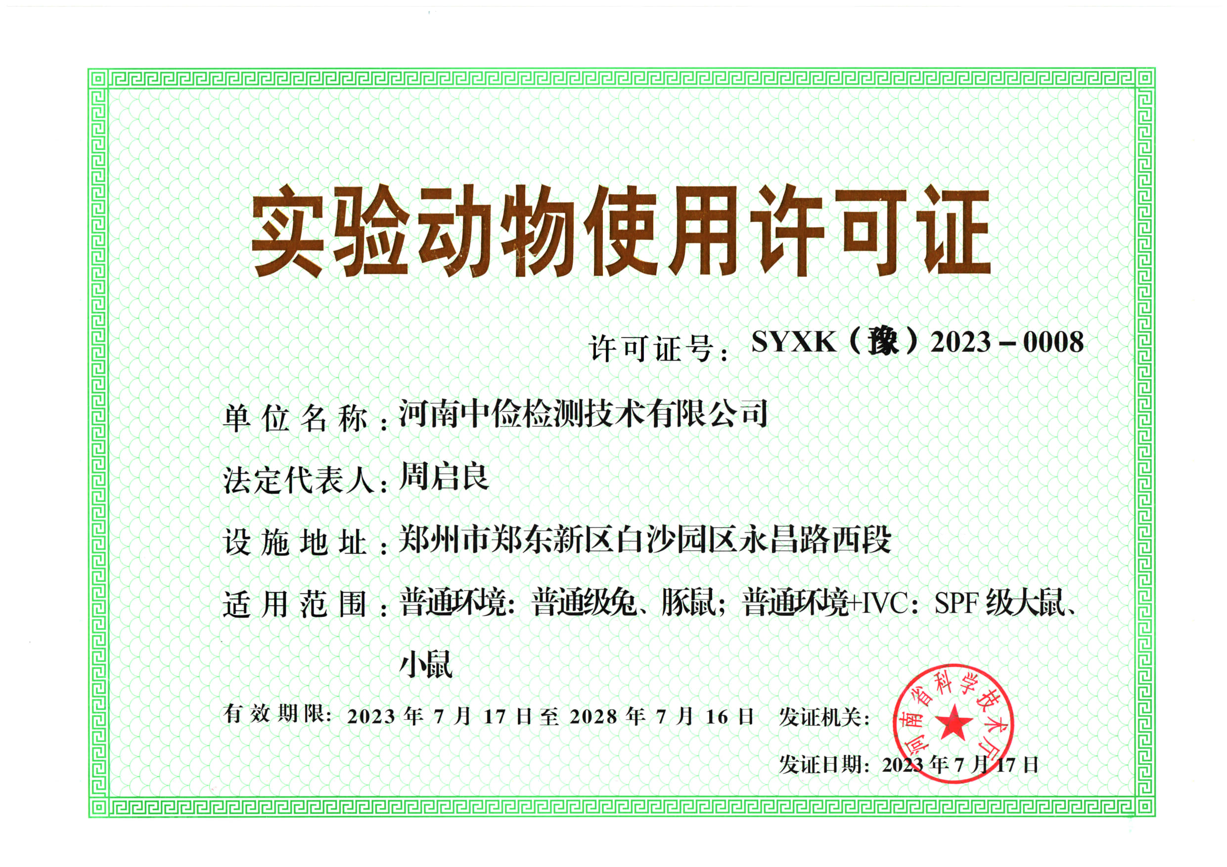 - 喜報!河南中儉檢測取得新的實(shí)驗動物使用許可證!